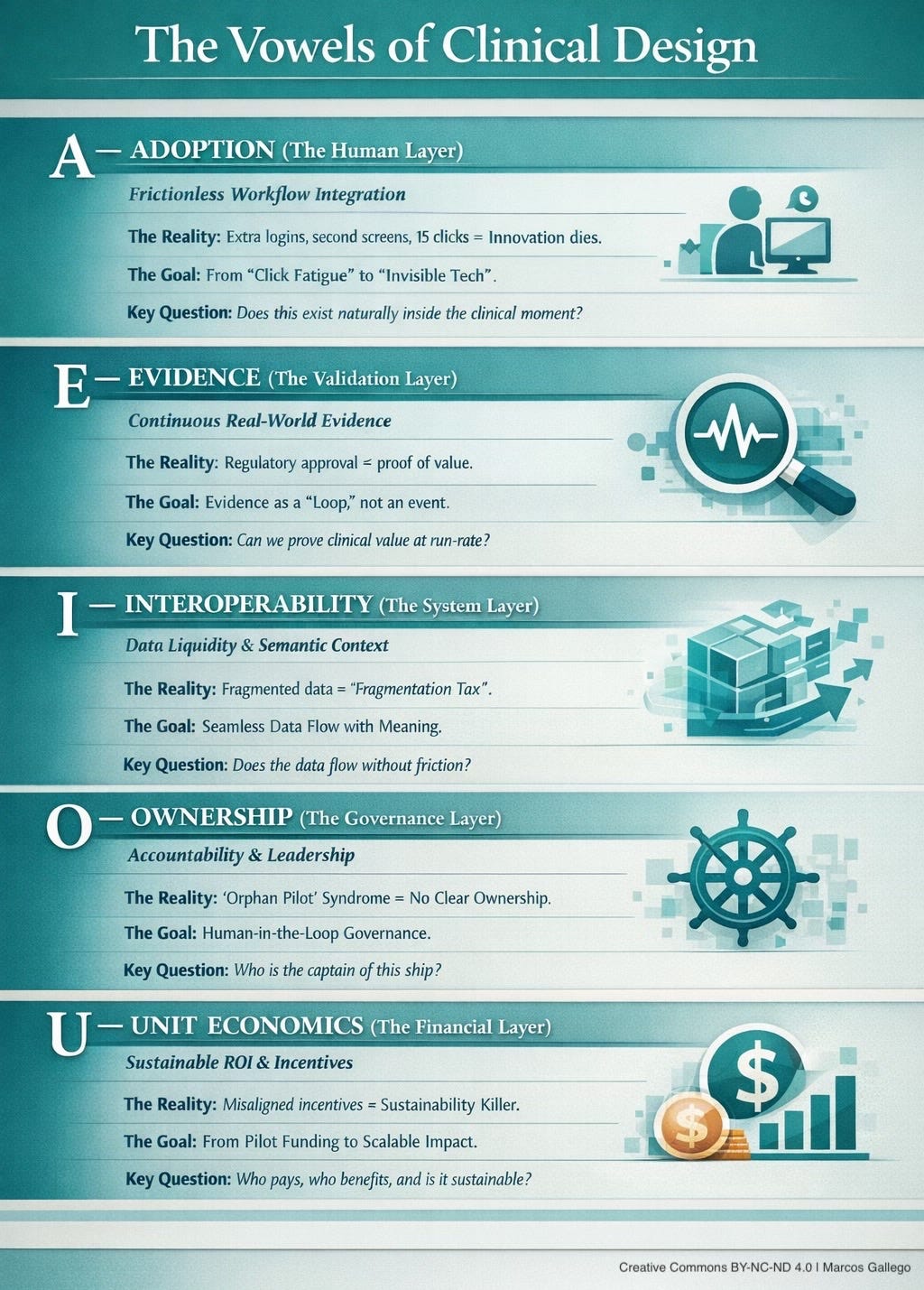 The Framework: To succeed, you must solve for the Vowels of Clinical Design (AEIOU): Adoption, Evidence, Interoperability, Ownership, and Unit Economics.