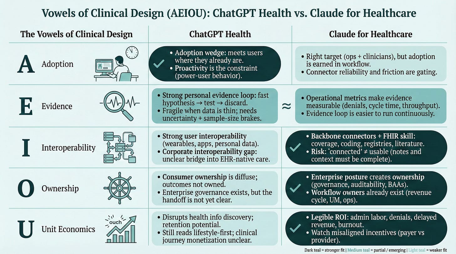 Viewing ChatGPT Health vs. Claude for Healthcare through the academic lens of the Vowels of Clinical Design (AEIOU)
